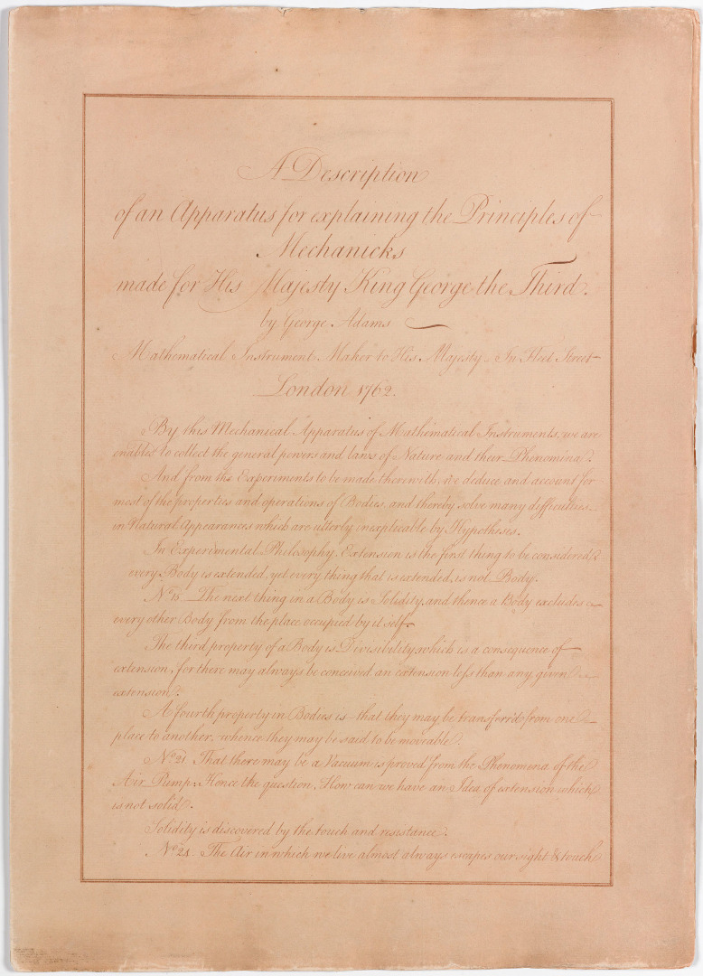 In the preface to his 1747 ‘A catalogue of mathematical, philosophical and optical instruments’, Adams publicised his use of books in compiling and designing a wide variety of instrument types. He wrote, ‘In the construction of all the Machines I have ever made, my first and greatest Care hath been to procure good Models and Drawings, several of them I have imitated from the best Authors, as well Foreigners, as those of our own Country; I have alter’d and improv’d others, and have added many new ones of my own Invention’ (Adams, 1747a, p 244). This statement can be applied directly to the group of machines Adams designed and made for George III in 1761–62. As a guide to the construction and use of these instruments, Adams also provided two lengthy manuscripts (1762a), one on pneumatics and one on mechanics[1].