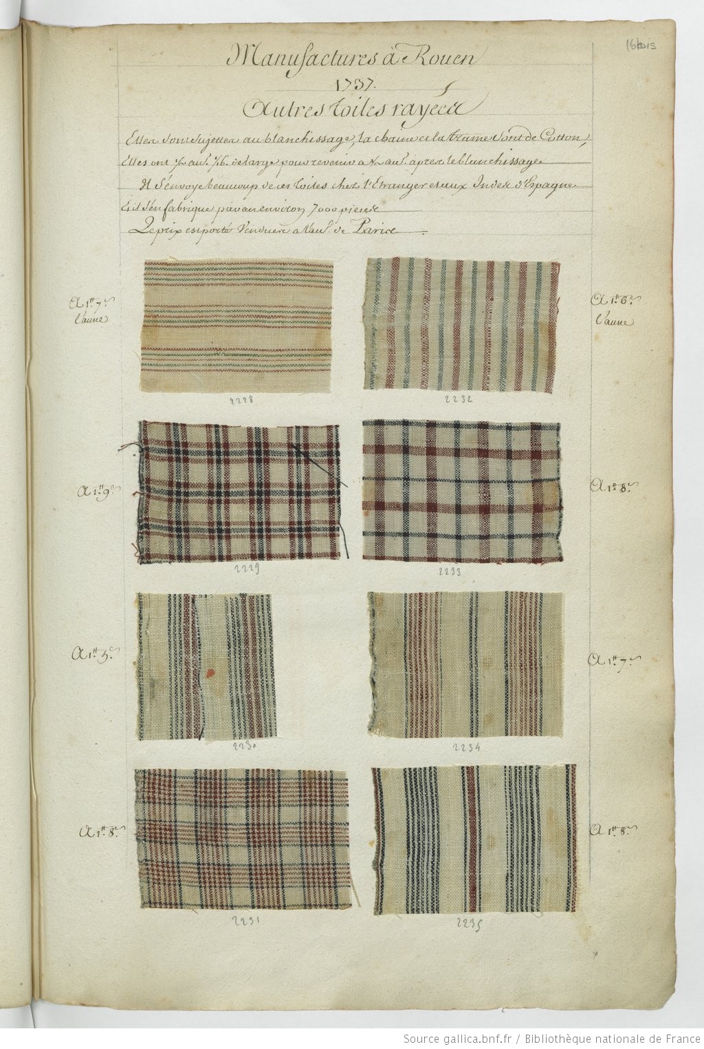 From the sixteenth century, Indian cotton cloths made their way to the trading world of the Atlantic. These textiles found appreciative buyers in West Africa (some Indian cottons may have reached that region from East Africa even before Europeans rounded the Cape of Good Hope). But by the eighteenth century the West African appetite for these cotton textiles seemed insatiable. Between 1700 and 1806, when the British outlawed the trade, Indian cotton cloth represented a third of the goods that British traders exchanged for enslaved men, women and children on the West African coast (Johnson, 1990, pp 28–29). To put this figure into perspective, Indian cottons were used to purchase two million men, women and children in the eighteenth century (the peak period for this trade). French sample books give us an idea of the florals, checks and stripes that West Africans demanded and two examples are given in Figures 15 and 16. Some of these cloths were made in Rouen and Marseilles.