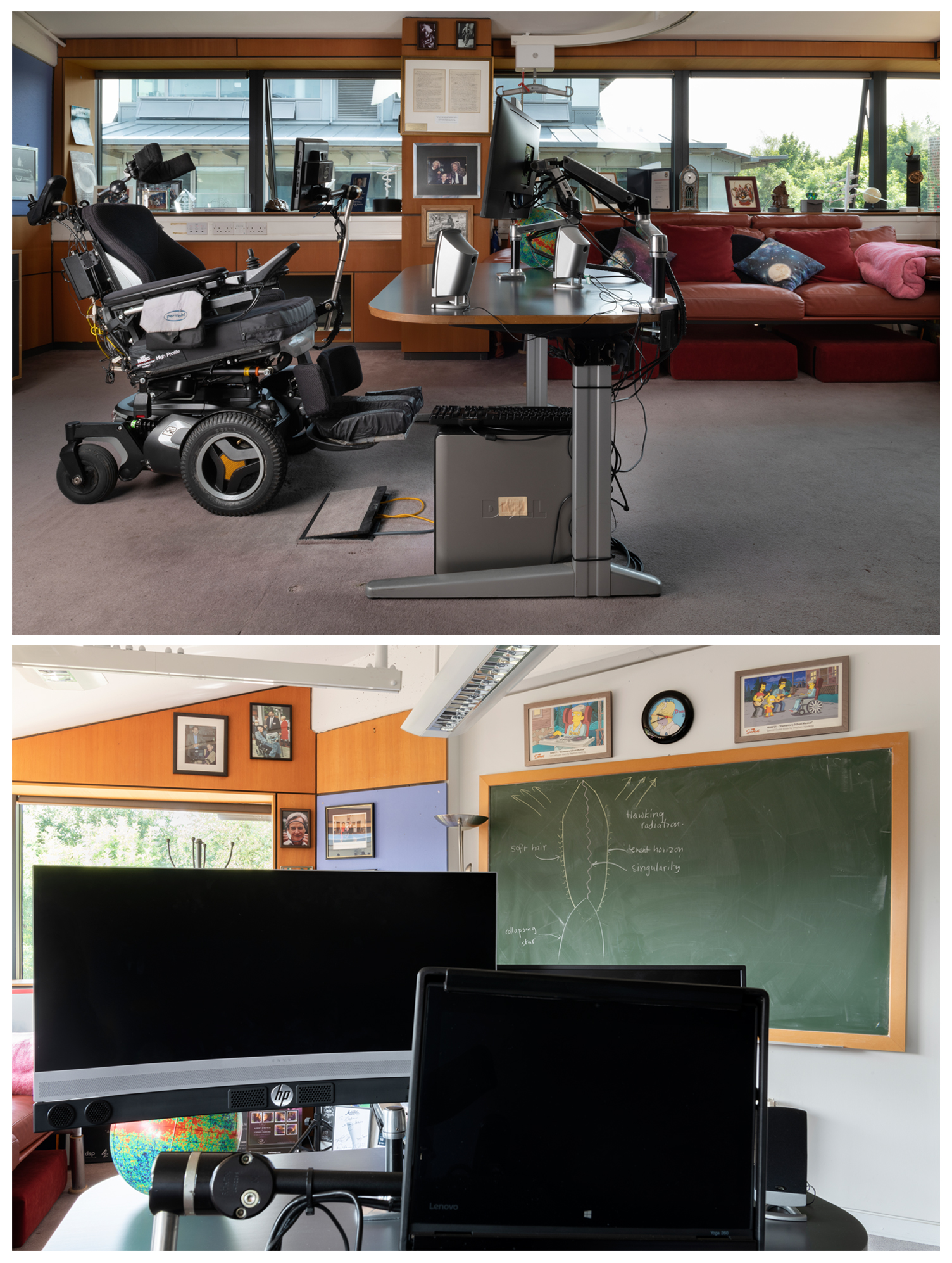 The development, use and maintenance of a series of assistive technologies and the regular medical activities needed to sustain Hawking as an active professor, colleague, husband and father were part and parcel of his life and work. The physical setup of the office and the objects in it enabled him to perform his role as an influential scientist and celebrity, and to live an active life with MND. From blackboards, books and theses, to wheelchairs, communication devices and computers, each object reveals a part of what it took to be Stephen Hawking, for the individual and for his wider entourage. Considered as a whole, the office provides a unique insight for historians of science (and those interested in museum studies and science and technology studies) into the construction and memorialisation of scientific practice and personality.