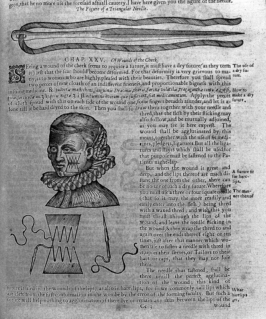One often-repeated image first appeared in Ambroise Paré’s (c. 1510–1590) La methode curative des playes, et fractures de la teste humaine (Paris: 1561). It depicted a neatly dressed woman with a completed dry seam on her cheek, alongside an illustration of the plasters and needles in media res, the whole clearly showing that the patches rather than skin were being stitched together. The image was often adapted in later publications by giving the woman current and more local clothing, thus ensuring that the technique appeared up-to-date. One variation appeared in the French and English editions of Jacques Guillemeau’s (c. 1550–1613) Les oeuvres de chirurgie (Guillemeau, 1598, p 143; 1598b, sig. b1r). Peter Lowe (1550–1612), who practiced briefly in London before settling in Glasgow, copied Guillemeau’s illustration for the extended 1612 edition of his Chyrurgerie (1597) (1612, p 288). The image was anglicised with a modern outfit for the woman for Johnson’s 1634 English translation of Paré’s complete works, and this version was retained for the 1665 edition. Johnson’s printer, Thomas Coates, used this version in Alexander Read’s extended summary of Helkiah Crooke’s Microcosmographia (1615), published as Somatographia anthropine (Read and Crooke, 1634, sig. Z3r).