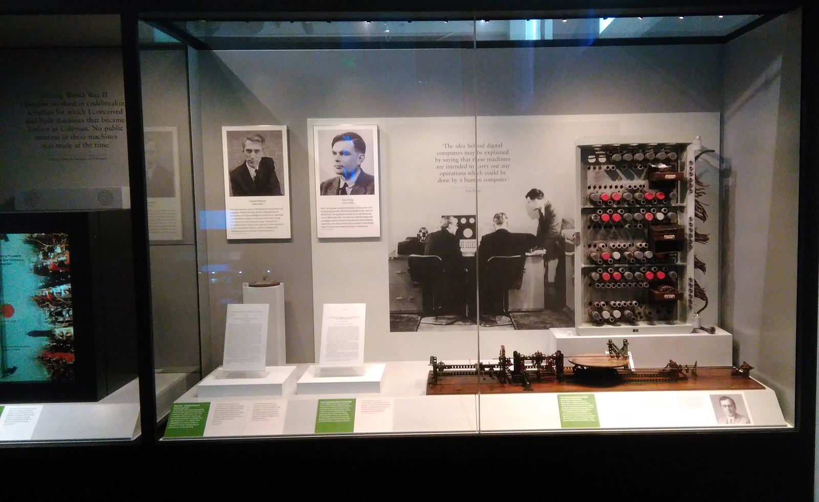 At first glance, this collection of objects implies that the theme of the exhibit is a chronology of British computing from the period between 1930–1950, featuring Turing, Hartree, and Ferranti. However, a closer observation of the order of the objects and the labels in the exhibit shows that the Trainbox – despite being the earliest object chronologically – comes fourth in the order of display.