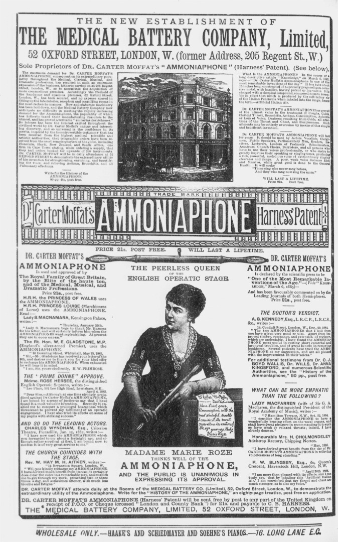 In the latter decades of the nineteenth century, it was difficult to open a newspaper without being bombarded by a range of advertisements for various nerve remedies and quack medicines, purporting to cure all manner of ills induced by the wear and tear of modern life. In an article written for the literary and political periodical Arena in 1894, the American artist and philosopher Elbert Hubbard identified ‘A New Disease’ that he believed was emerging as a penalty of the progress of modern civilisation. The ‘latest thing in neurotics is paranoia’, Hubbert declared, and it was a condition that he insisted was being deliberately fostered by the endless schemes for self-treatment that were being ‘thrust at us from the columns of every daily’, seen in shop windows in ‘dainty little push boxes containing hypodermic outfits’ and ‘rail announcements of “the only sarsaparilla” and “the kind that cures”’, and ‘pepsin, hypophosphates, bromide, cocaine, chloral are sold on every hand’ (Hubbard, 1894, p 77). Such an overabundance of nerve tonics and remedies, Hubbard added, paradoxically worked on the mind of the observer in order to incite the kind of fear and nervousness that they purported to prevent. Like so many of its counterparts, Carter Moffat’s Ammoniaphone was a quack medical remedy that employed new networks of advertising and the penny post to provoke and to respond to medical and professional anxieties of the age. Exploiting contemporary notions of British singers’ inherent biological, physiological, and even geographical inferiority to their Italian counterparts, the Medical Battery Company’s marketing strategy served to stimulate anxiety within the musical profession while offering a very simple means of relief – for a certain price.