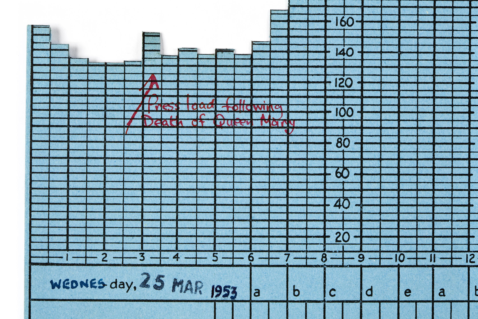 Each load curve is characterised by a period of low night-time demand. The night-time base load most likely consists of activities that were either in constant demand for electricity, such as the functioning of the cold chain; or activities that mostly took place in the night time, such as street lighting, night-time storage heating, or some commercial activities such as the working of press office machines, newspaper printing, or bakeries. Even though the object does not give us clues about what electricity was used for, some cards are an exception. For example, the death of Queen Mary on 25 March 1953 was marked down on one of the cards as a special event causing a peak at 03:00 due to a sudden press load from newspaper printing (see Figure 12).