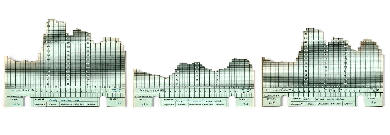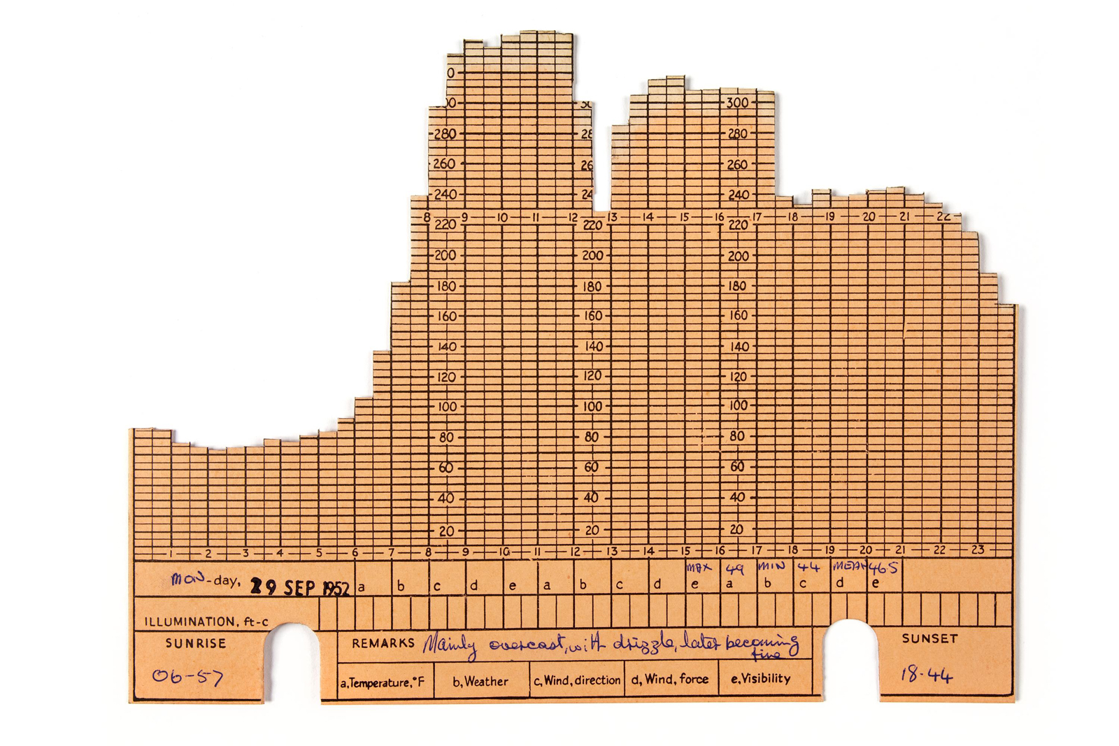 Each card shows the demand for electricity in megawatts (MW) for each half-hour period over 24 hours, from 2 October 1951 to 30 April 1954 (see Figure 5). Despite the accompanying key showing a seven-day week, there are only cards for Monday to Friday, mass printed in the five colours, and then annotated with a date stamp and a handwritten prefix for the day of the week.