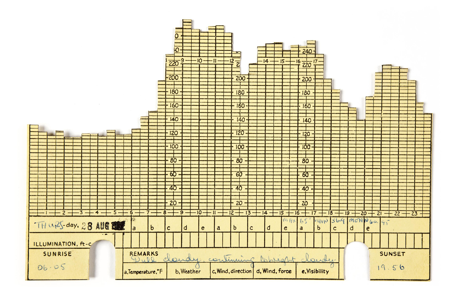 Taken together, evidence from the object led to the following interpretations. The chart was probably assembled day-by-day, or for a group of days, rather than all at once, and the values were cut into the cards by hand – a time consuming task. Daylight hours and weather variables were important enough to record, and the whole chart was probably on display for some period after initial construction. We were not able to find a similar object with which to compare it for Fleming’s (1974) step of ‘evaluation’, but it seemed to have a purpose beyond the recording of daily load curves – a need to see the data in relationship, or trends. An analysis of these trends would also fulfil Fleming’s third step of ‘cultural analysis’: the relationship of the object to its culture.