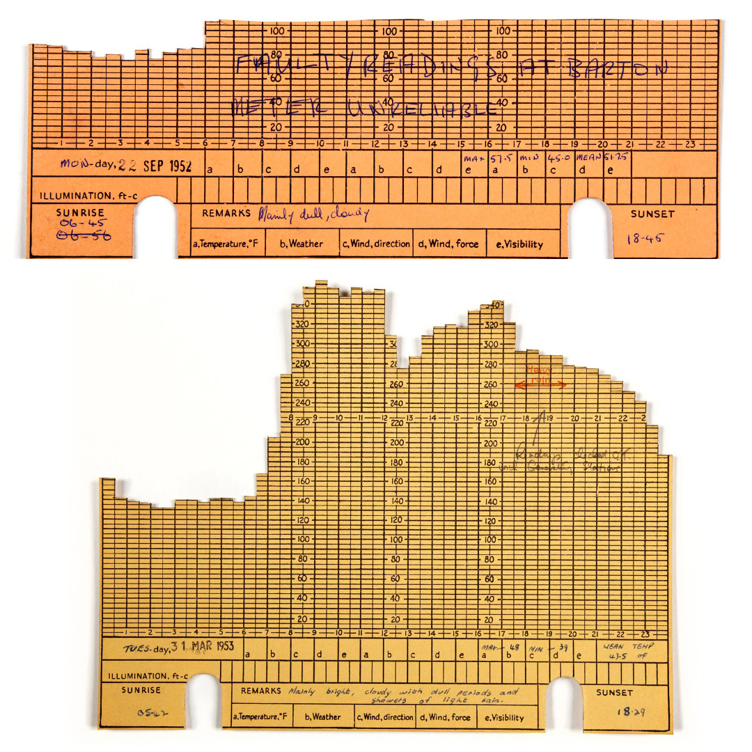 There are also occasional annotations written onto the graphical section of the card, two of which give clues about the geographic area from which the data was drawn. The two cards shown in Figure 7 refer to ‘Barton’ and ‘generating stations’ in the plural suggesting the area included Barton power station, and at least another. Using data on plant capacity from Swale’s Forerunners of the North Western Electricity Board (Swale, 1963), and the value of the highest peak demand (450 MW on Tuesday 2 December 1952), we surmise that the meter readings were taken from generating stations in the Board’s Sub-Area Number 1 – Manchester, the generating stations that were owned by Manchester Corporation before nationalisation in 1948.