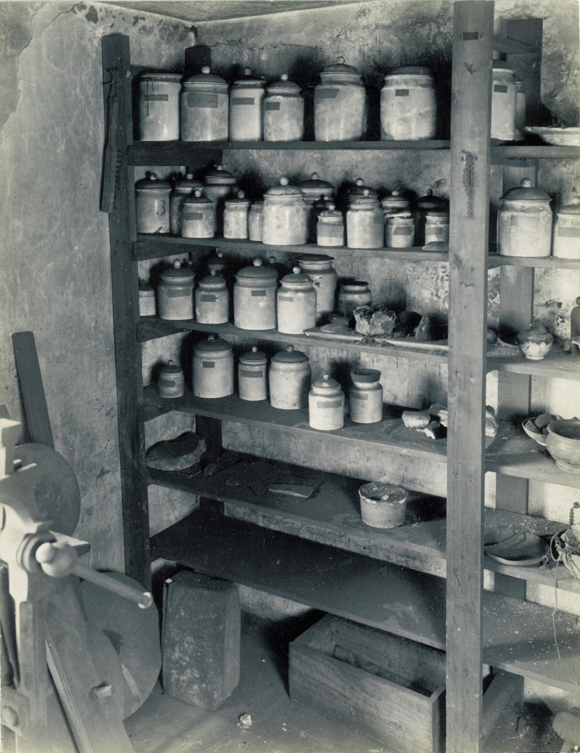The workshop was acquired as a shrine to the man Thomas Carlyle called ‘Watt of the Steam engine… this man with blackened fingers, with grim brow…searching out, in his Workshop, the Fire-secret’ (Carlyle, 1869). However, there is very little in the workshop pertaining to the steam engine. Out of more than 8,000 objects, only seven or eight can be linked directly to Watt’s steam projects, although what there is has proved to be very significant, such as the original model of the separate condenser, which was concealed amid the mess of objects on the workbench until the late 1960s, when it was finally identified by Rodney Law (Law, 1969). These steam artefacts are accompanied by a multiplicity of other items, covering not just science and technology, but aspects of the decorative arts and the world of consumption, too. There are 26 plaster moulds to copy figures designed after the Antique as well as some hundreds of small pieces of sculpture, cameos and portrait medallions intended as feedstock for Watt’s sculpture-copying machines. The workshop drawers contain tools intended for the manufacture of musical instruments: there is a complete set of tools, reamers and rotary files for making flutes in bulk, and ‘purfling’ tools to inlay thin strips of wood into the bodies of stringed instruments[12]. There are also more than 140 different chemical substances tied up in paper wrappers, or held in jars and tiny wooden boxes. Fifty of these were intended primarily for use in the manufacture of glazes and ceramic bodies for pottery, 23 were artists’ colours, and others had medicinal uses (Insley, 2011) (see Figure 4).