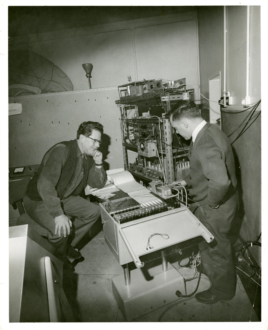 This uneven application of the cybernetic perspective – rendering women’s labour in mechanistic terms while preserving the work of men as abstract, intellectual and irreplaceably ‘human’ – left women in scientific occupations particularly vulnerable to marginalisation and even replacement via automation. For example, Walter’s research became increasingly reliant on feminised mechanical substitutes for his female colleagues as the 1950s progressed. Nowhere was this more apparent than in his creation of ANNIE, an automatic wave analyser that organised brainwave patterns into distinctive alpha, beta, theta and delta frequencies. Acting as assistant and interpreter in Walter’s EEG work, ANNIE began to encroach upon the role that Vivian Walter had once occupied, as depicted in earlier photographs of the pair’s scientific partnership (Hayward, 2003, pp 623, 631). Walter’s attribution of distinctly feminine identities to such machines did not pass unnoticed by his colleagues and peers. As Mollie Brazier, a pioneering electroencephalographer working in Massachusetts General Hospital in Boston, noted: ‘I am considering having ruffled curtains of white Organdie for my room and Annie’s just to show that we are both feminine.’[14] Displaying once again the tendency to render in erotic terms the engagement of women with neuroscientific machinery, Walter rejected the possibility of ANNIE being surrounded by demure white cotton. ‘I have a leaning for black satin myself,’ he replied, ‘with lace peepholes tactically disposed!’[15]