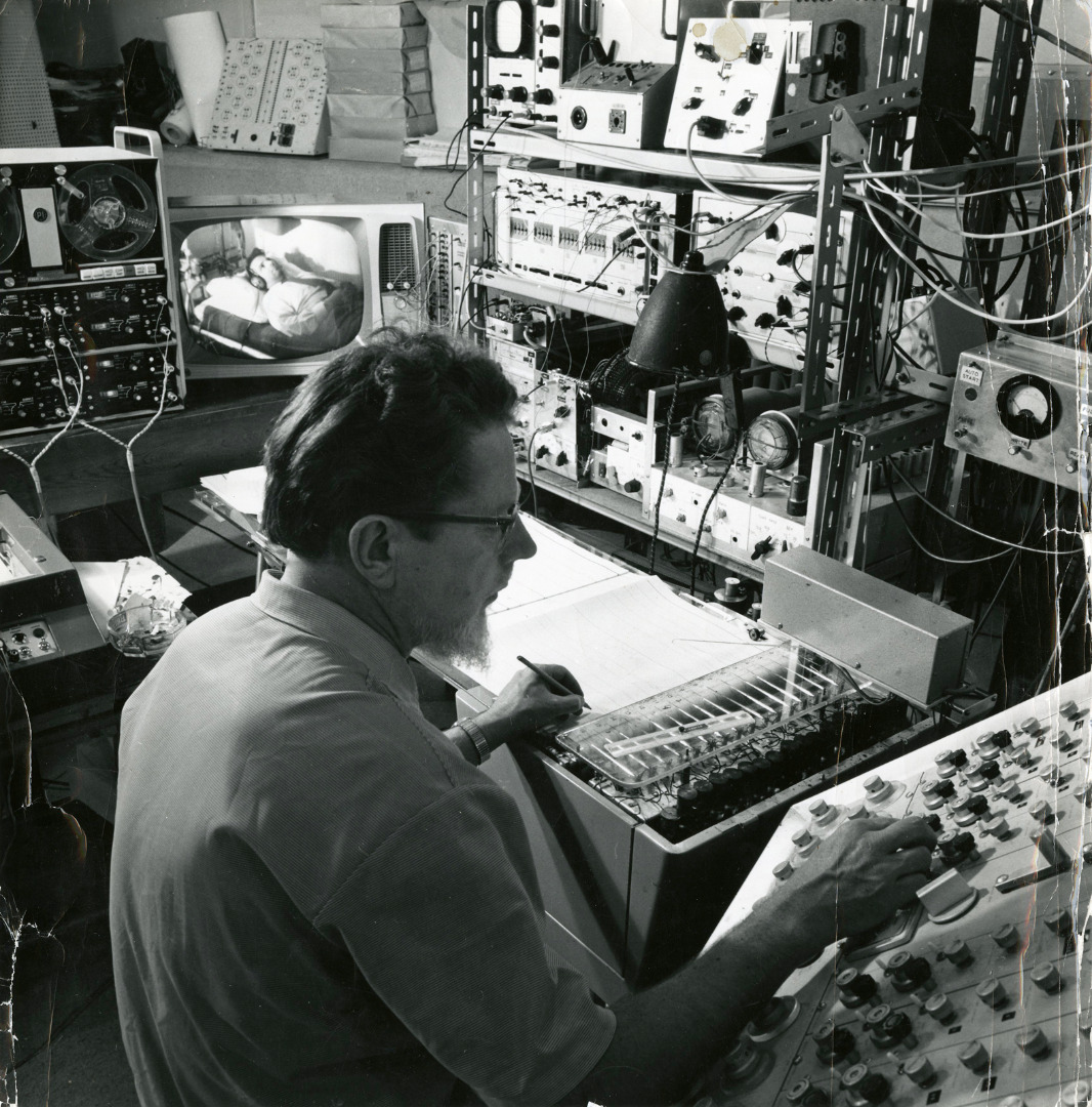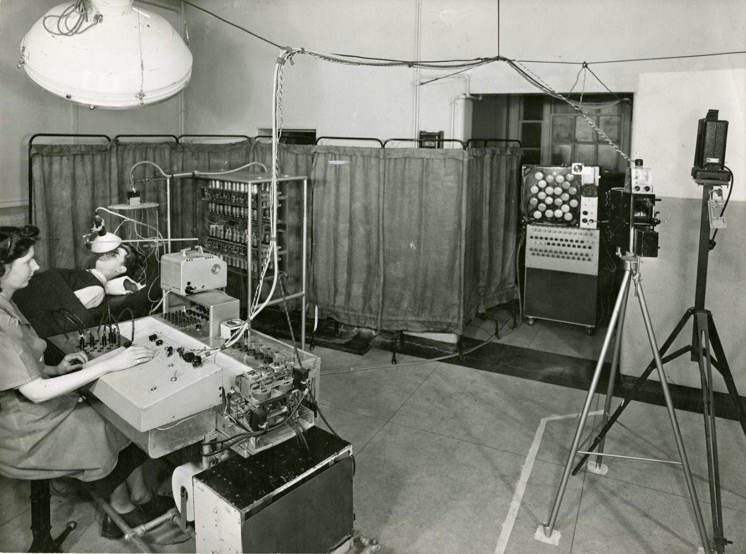 The distinctive kind of cybernetics practiced by Walter and others at the BNI entailed a peculiar way of thinking about the interactions between humans and machines, one that privileged the flow of information between them rather than their respective material forms. As such, through a cybernetic lens, the human actor is less a unique and inimitable entity than a roughly comparable organic counterpart to the machine. In turn, this requires all those involved in cybernetic research, including the supposedly ‘neutral’ experimenter, to be considered part of an interdependent and mutually transformative circuit (Hayles, 1999, pp 62–65; Hayward, 2001, pp 629–630). This perspective was reflected in many of the experimental designs and set-ups developed within the BNI’s laboratories, in which human brains were perceived as ‘wired’ into networks that blurred the boundaries between the organic and the mechanical (see Figure 12).