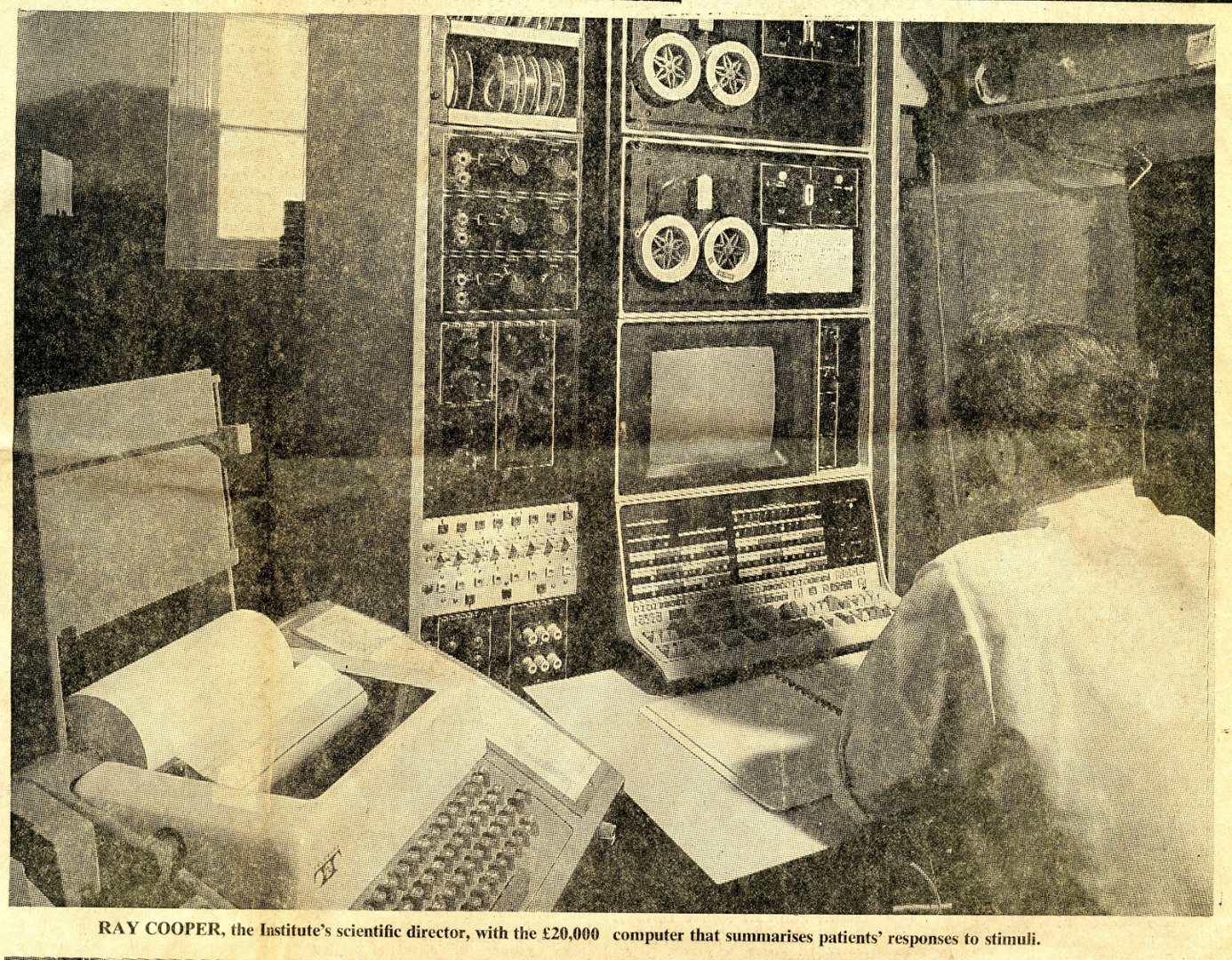 After encountering any given story written about the BNI in the middle decades of the twentieth-century, the average newspaper reader might be forgiven for assuming that the ground-breaking research described to them had been conducted entirely by male scientists. Indeed, across the thirty years’ worth of press clippings included within the BNI Papers, just one image depicts a female employee of the Institute at work: a photograph of nurse Judy Henderson fixing electrodes to the head of a patient awaiting an EEG examination, printed as part of a ‘photo review’ celebrating the Institute’s achievements in the Bristol-based Gazette on 28 October 1972 (see Figure 1). Intended to inform a largely uninitiated readership about the BNI’s existence, activities and achievements, such press shots represent a simplified and self-conscious performance of daily research practices, albeit one mediated by the desires of commissioning editors and the aesthetic choices of visiting photographers (see Blair, 2015). As such, these photographs might gesture towards some of the unspoken assumptions about the gendered division of labour within the neuroscientific laboratory. With her activities framed as a supportive act of patient care, rather than a direct contribution to research, Henderson’s photograph suggests a distinct and limited role for women in the BNI’s work. This division between male intellectual and female carer is bolstered by the position of the photograph on the page, flanked by images of white-shirted male scientists engrossed in their work at the helm of imposing and expensive pieces of high-tech machinery (see Figures 2 and 3).