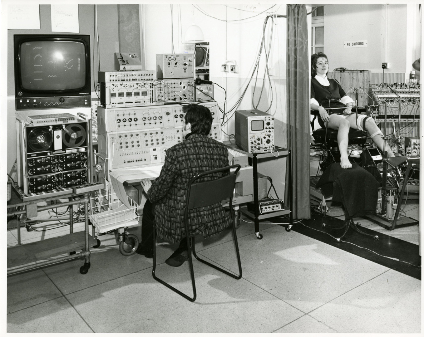 However, rather than focusing on employees such as Henderson, published photographs of the BNI far more commonly identified women as the objects and subjects of neuroscientific research. A typical example of this can be seen in a set of press photographs taken in the laboratories of the BNI in 1970, during a period of intensified media interest about the Institute’s work on computerising the diagnosis of conditions ranging from schizophrenia to chronic migraine. In the first image, besuited neurologist Demetrios Papakostopoulos is shown at the controls of an EEG while an anonymous young woman sits in the next room, constrained by a mass of wires and electrodes (see Figure 4). The image establishes a clear division between male experimenter and female participant, made all the more explicit by their physical separation either side of the dividing wall and curtain.