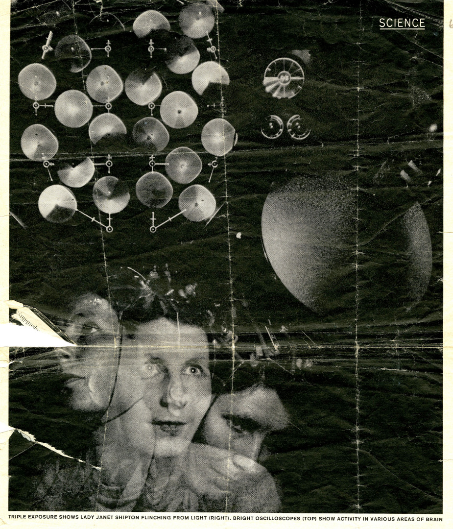The second photograph, taken by Bristol photographer Desmond Tripp, depicts Janet Shipton sat in front of a six-channel EEG, conducting research with a similarly complex experimental circuit (see Figure 14). To her left is a reclining male subject, his face obscured by a stroboscopic lamp; on the opposite side of the room stands a 22-channel toposcope, a machine designed to provide a real-time visual map of the subject’s brain responses through the patterned illumination of light bulbs; to her right is a video camera, positioned to record the entire experiment. However, unlike the previous photograph of Walter, it would be difficult to argue that Shipton is the primary visual focus here: indeed, her body is partially cut off by the frame. Instead, she is given no greater visual presence than the anonymous male subject beside her or the pieces of complex machinery positioned around the laboratory. The relatively equal spacing given to each constituent part of the experimental circuit – the operator, the subject, the EEG, the toposcope, the video camera – underscores the networked totality of cybernetic research rather than Shipton’s unique position at its helm. Thus, while the depiction of Walter remains a relatively conventional ‘portrait’ of the scientist at work, Shipton’s photograph has more in common with circuit diagrams and unpopulated images of experimental set-ups, transmitting a cybernetic worldview in which man (or, more accurately, woman) and machine are almost indistinguishable.