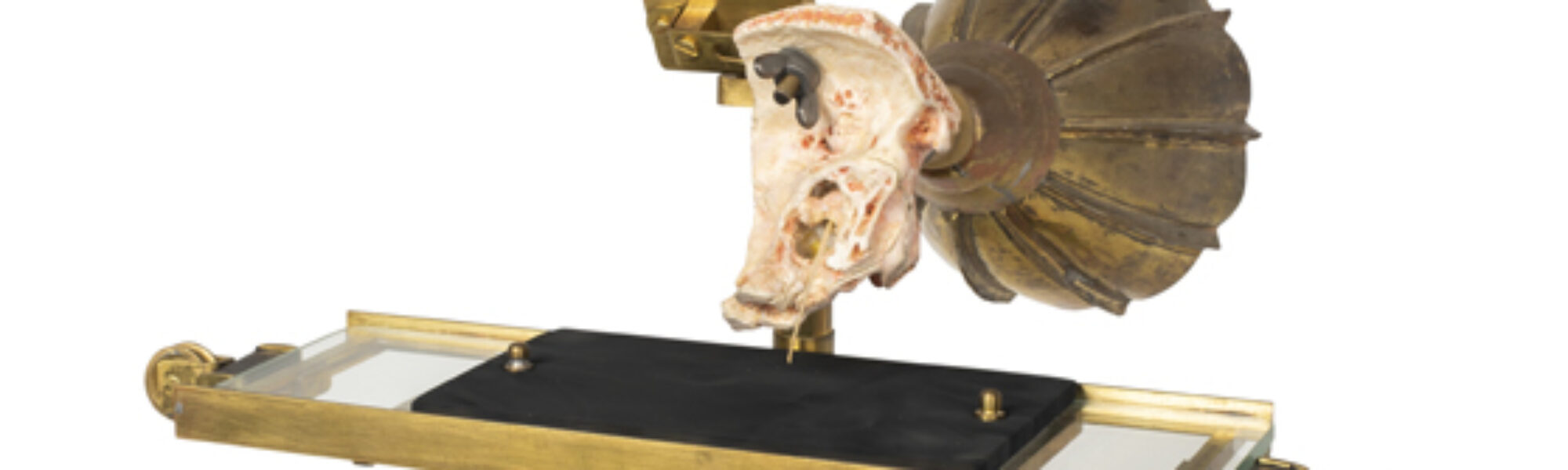 Once the mouthpiece and moving glass tray assembly were completed and affixed to the main structure, the final step was figuring out what to do about the most iconic piece of the puzzle: the human middle ear. Although we were committed to producing the instrument with as much faithfulness to the original as possible, we had serious concerns about obtaining a real human specimen for use in our reconstruction. For one, the ear was – and remains – one of the most controversial aspects of the original instrument. To date, nobody has been able to say for certain who was ‘the true hero – a specimen of a human ear – donor unknown’ (Snyder, 1974, p 3), though the ear(s) were likely acquired without prior consent and by potentially dubious means (see Sterne, 2001; Ma, forthcoming 2020).[19] Blake himself was opaque on the issue, stating only that the ‘membranes employed in [our] experiments have been preferably those of the human subject, as being most readily obtainable under favourable conditions’ (Blake, 1876, p 110). Interpreted historically, this statement becomes both problematic and unsettling. As Ming-Yuen S Ma writes: