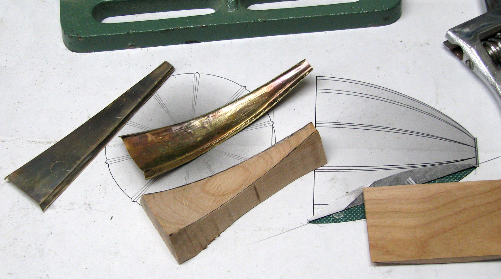 Our designer proposed fashioning the mouthpiece out of thin brass strips, which he felt would best approximate the look and finish of the mouthpiece as depicted in our reference images. This material would also provide maximum flexibility in terms of how it could be cut and coloured, and had the additional benefit of not adding too much additional weight to the overall structure. Once this was agreed upon, he set about preparing ten brass strips which were then hammered into shape and soldered together to form the requisite bell shape of the mouthpiece (see Figure 4). To the narrow base of the mouthpiece, he then affixed a short cylindrical steel rod that would serve to funnel sounds directly from the mouthpiece into the ear canal of the middle ear specimen once it was completed (see Figure 5).