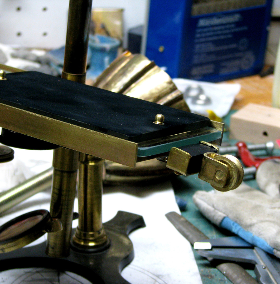 Upon completing the prototype, several issues became apparent that we had not anticipated at the outset of the build. The first problem was the overall instability of the finished structure. More specifically, the three-pronged base of the microscope appeared too small to support the weight of the moving glass assembly and the instrument became tippy and unsafe to operate. After reviewing the instrument against our reference images, it became clear that the original base was indeed larger than ours. More than this, a closer examination seemed to indicate that the base was positioned differently than most period microscopes we had reviewed in the Museum’s collection.[[24] This suggested that the base of the original instrument might have also been adapted by Blake as he encountered similar difficulties. Rather than search for a larger base, we instead endeavoured to machine one that better matched the shape and size as depicted in Bell and Blake’s reports. We enlisted a member of our production staff, Paulus Heebink, who set to work developing a base pattern that could then be cast in brass by a local machinist. Once the new base was produced, he then affixed it to the structure and inserted an additional stem extension in order to increase the overall height and stability of the instrument. While it’s impossible to say to what extent Blake would have altered the microscope structure to end up with his final version, we can say with some certainty – upon comparing our reproduction against the original images – that he either started with a larger microscope or made similar adjustments as we had.[25] Once we were done, the new prototype looked a lot closer to the original and functioned in a much more stable and usable way (see Figure 17).