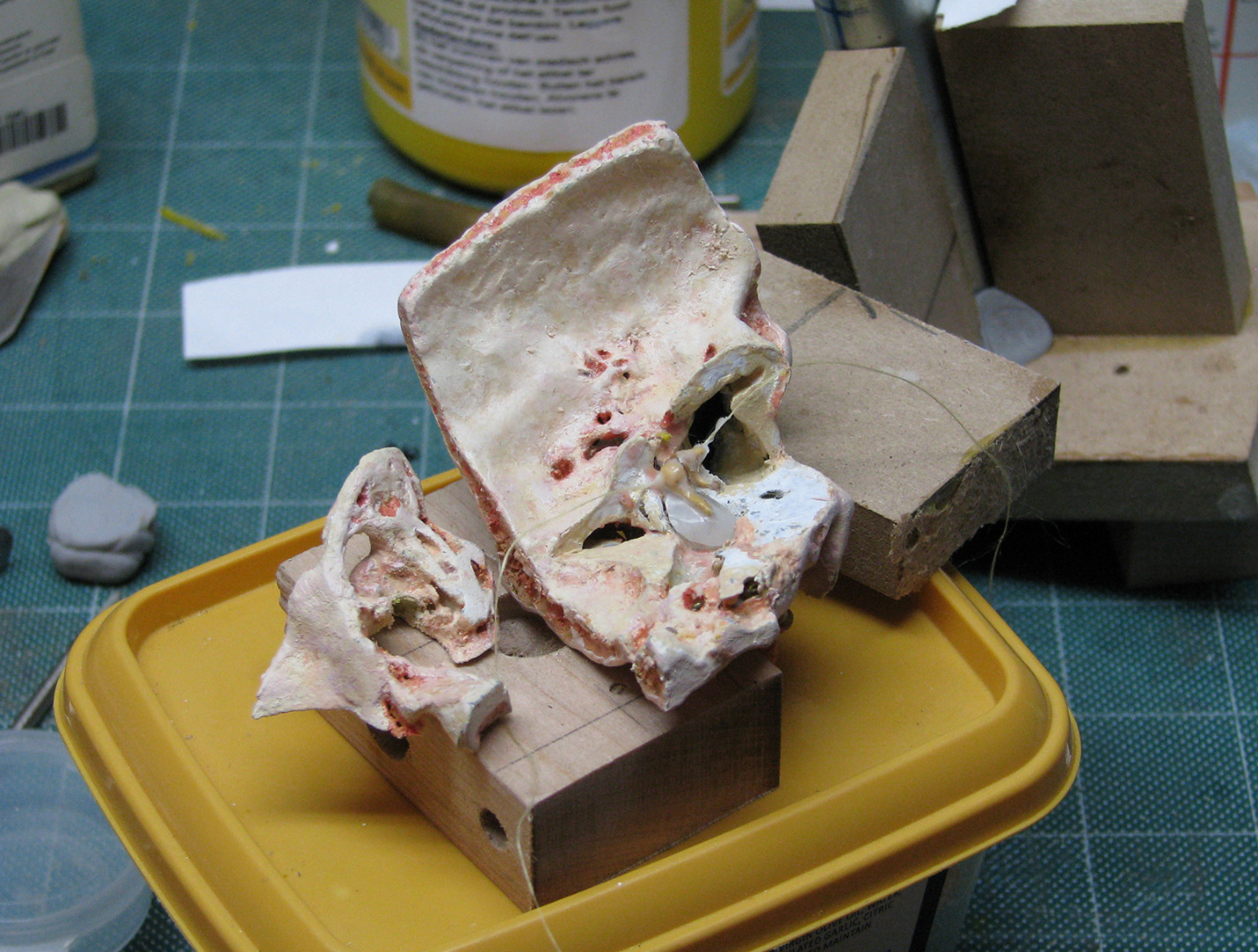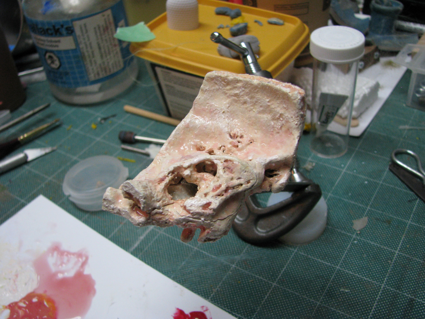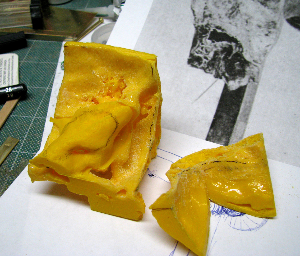 Once the print was completed, our designer then customised the ear by trimming and sanding down the edges to achieve a closer visual approximation to the ear pictured in our reference images, and then painting it to resemble real human bone tissue (he used a beef soup bone to approximate the appropriate colour and shading). The final artificial ear specimen is pictured in Figure 10.